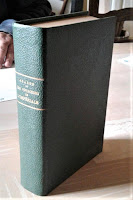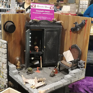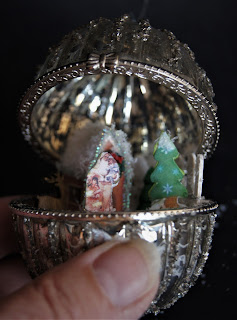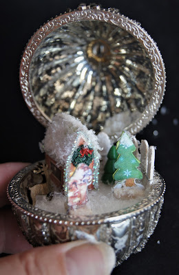 En guise de boitage, j'ai utilisé le magnifique livre de TOLKIEN "The Hobbit" que mon fils Jérôme m'a apporté de Toronto. Largement ouvert, il offre un nid douillet à ma scène miniature. Celle-ci mesure hors tout 25 cm de hauteur, 30cm de profondeur, et 27cm de largeur.